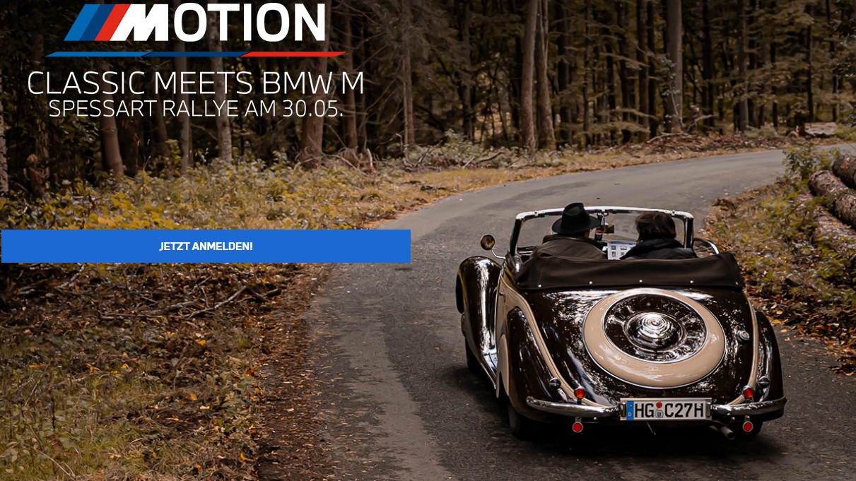 PROGRAMM: Individuelle Anreise und Check-In im Autohaus ARNOLD in Hösbach: Hier erhalten Sie von 08:00 - 09:00 Uhr Ihre Dokumente und Startnummer. Rallye-Start: Um 09:31 Uhr startet das erste Fahrzeug auf die wenig befahrenen Strecken durch den waldreichen Spessart. Dabei kommt es auch schon zu “Wertungsprüfungen”. Zwischenstopp, Restart & Ziel: Um 11:30 Uhr ist eine Kaffeepause am M-Stützpunkt des Autohauses ARNOLD eingeplant. Der Restart erfolgt um 12:00 Uhr und führt durch den Spessart zurück zum Startpunkt in Hösbach. Hier warten neben Essen und Getränken, auch aktuelle BMW M-Modelle zum Probefahren auf die Teilnehmenden. Die Durchführung der Probefahrten organisiert und verantwortet das Autohaus ARNOLD. Die Ausfahrt endet mit der Siegerehrung um 16:30 Uhr.